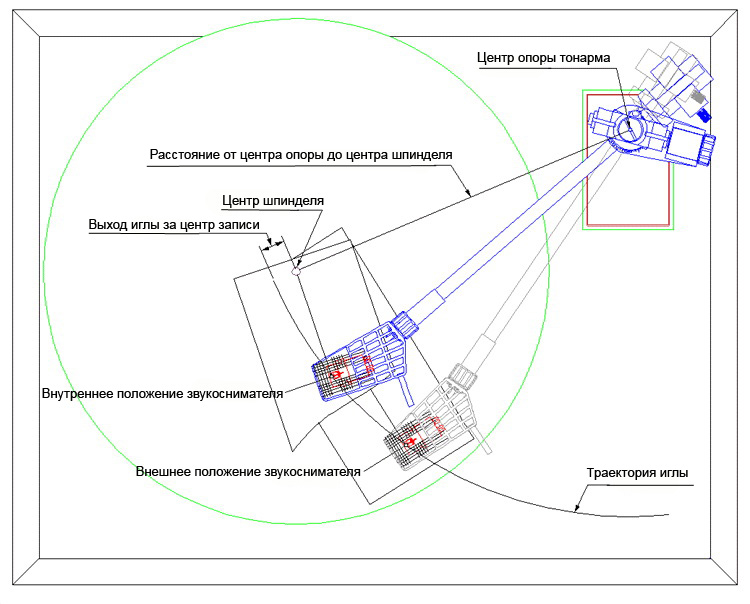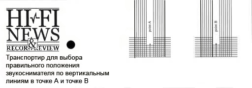 Наилучший результат выравнивания картриджа звукоснимателя достигается с помощью 2-х точечного транспортира. При правильной регулировке игла имеет идеальный радиальный контакт с звуковыми дорожками, а ошибки слежения сведены к минимуму. |