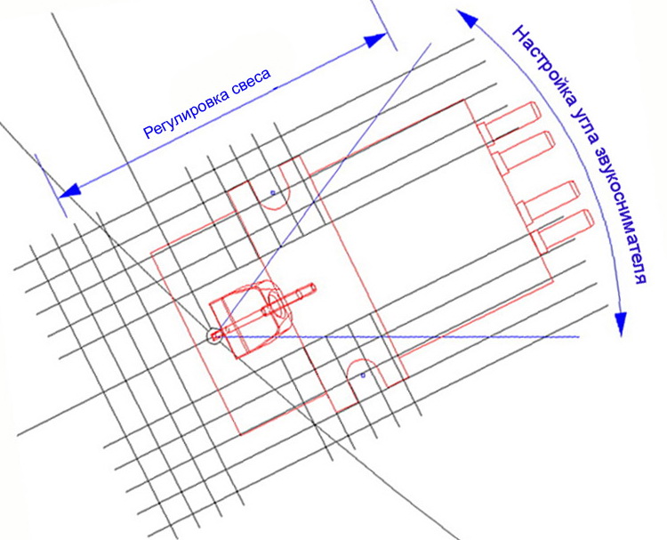 Для изменения угла установки, звукосниматель повернуть в гнезде крепления до параллельного выравнивания между консолью и линиями сетки транспортира. Как и при регулировке свеса, следует ослабить крепеж, чтобы можно было произвести регулировку, выбрав правильное положение.